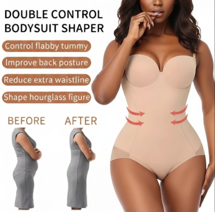 Double Control Bodysuit Shaper - Hourglass Figure (Black & Nude)